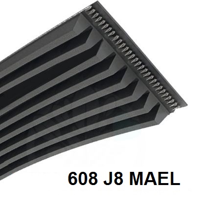 Courroie Poly-V spéciale Bétonnière. La courroie caoutchouc 608J8 a une trame Elastique, cela lui permettant d'être mise en place sans démonter de poulies. Courroie de marque HUTCHINSON Flexonic. Longueur: 608mm, Largeur: 18.72mm (8 dents et 7 rainures).
